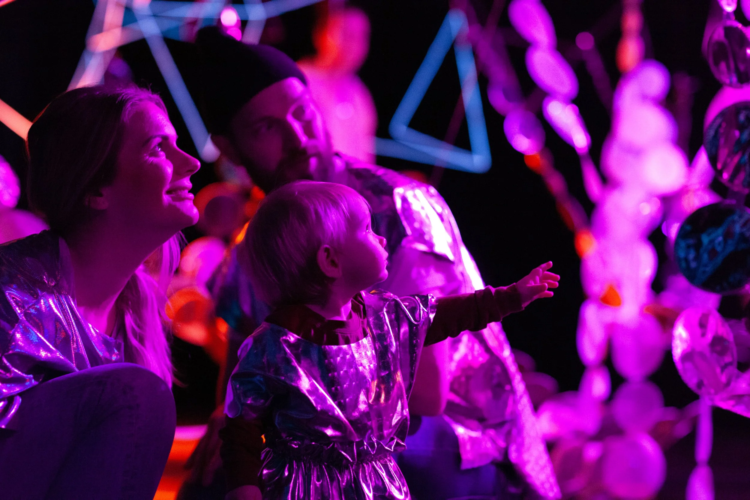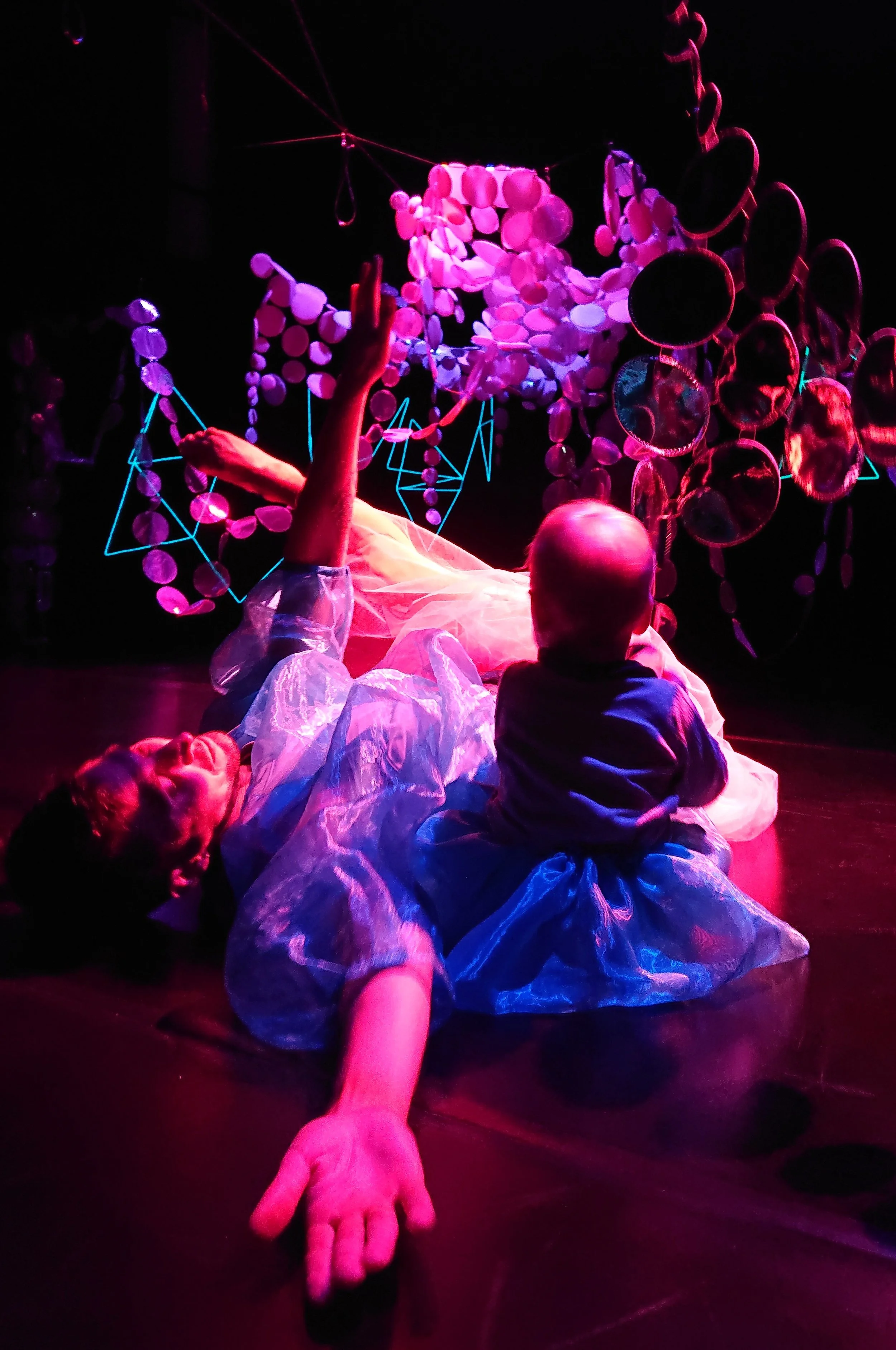 dAzzleMAZE er en scenekunstinstallasjon som er tilpasset de minste barna og barn med funksjonsvariasjoner. Alle sitteplasser er på gulvet. Publikum beveger seg fritt inn og ut av installasjonen etter eget behov.